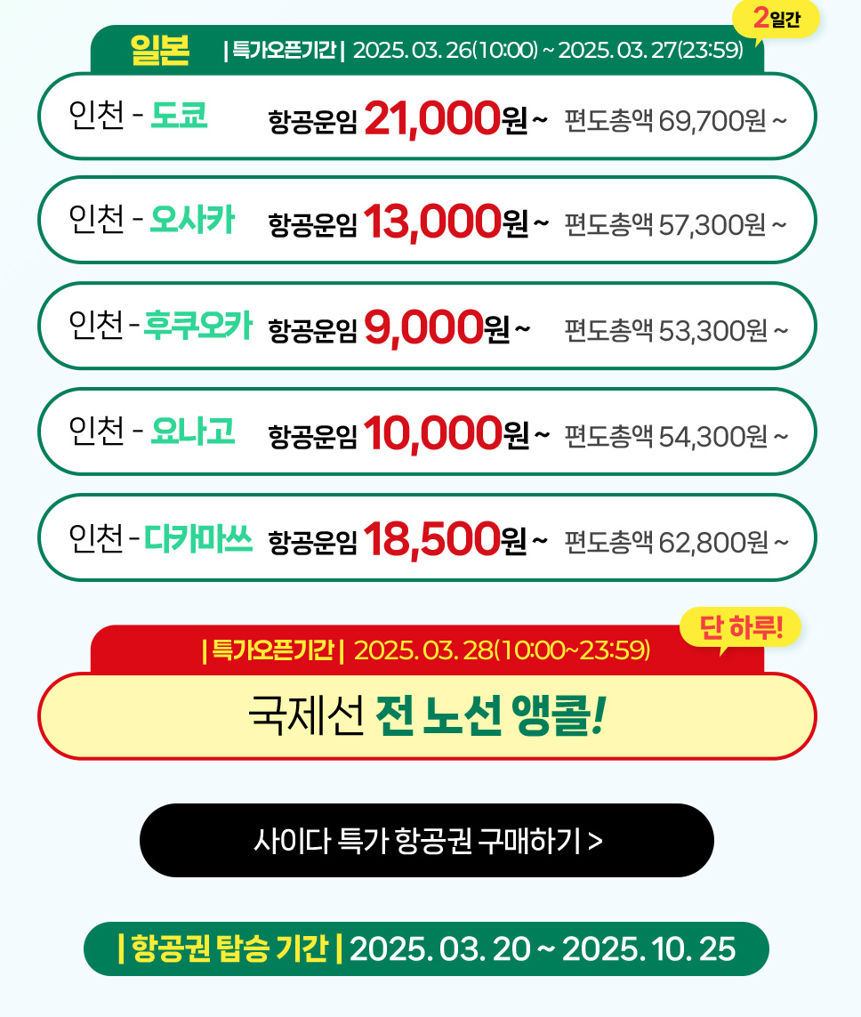 - 총 9일간 노선별로 특가 오픈일이 다르니 꼭 체크하세요!